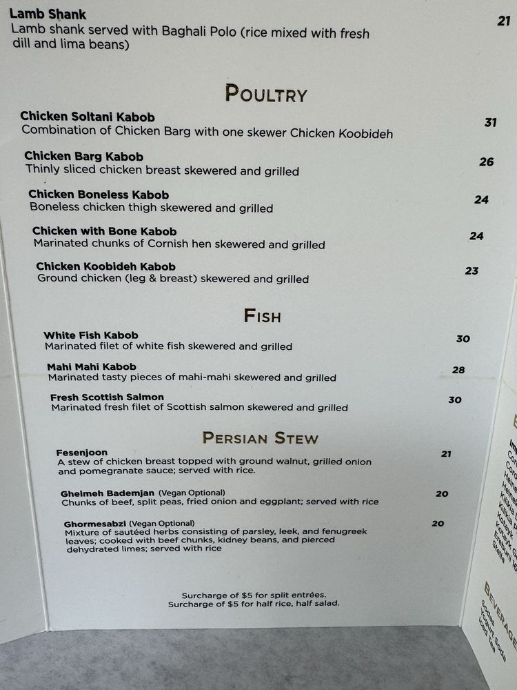 Combination of Chicken Barg with one skewer Chicken Koobideh, served with a choice of rice or salad with grilled tomato and Anaheim pepper.